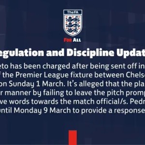 虎扑03月05日讯 英足总官方纪律条例更新:佩德罗-内托在3月1日星期日切尔西对阵阿森纳的英超联赛中,于第70分钟被红牌...