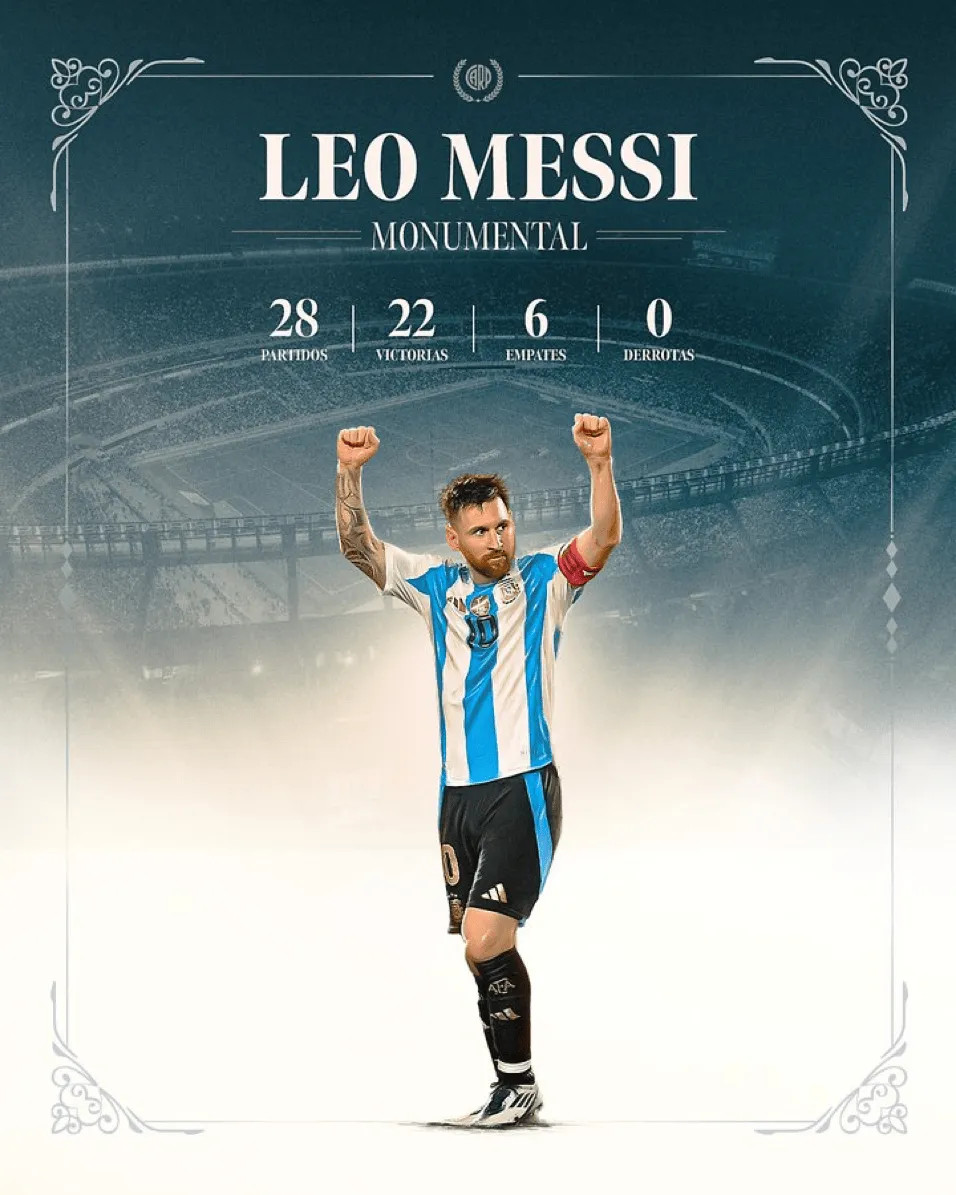 根据河床俱乐部的官方数据统计,梅西代表阿根廷队在纪念碑球场共参加了28场比赛,取得了22胜6平的不败战绩。