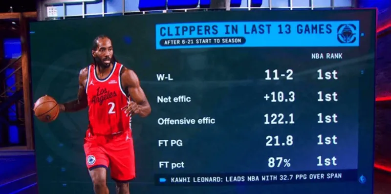 在过去的13场比赛中,快船取得11胜2负,期间: