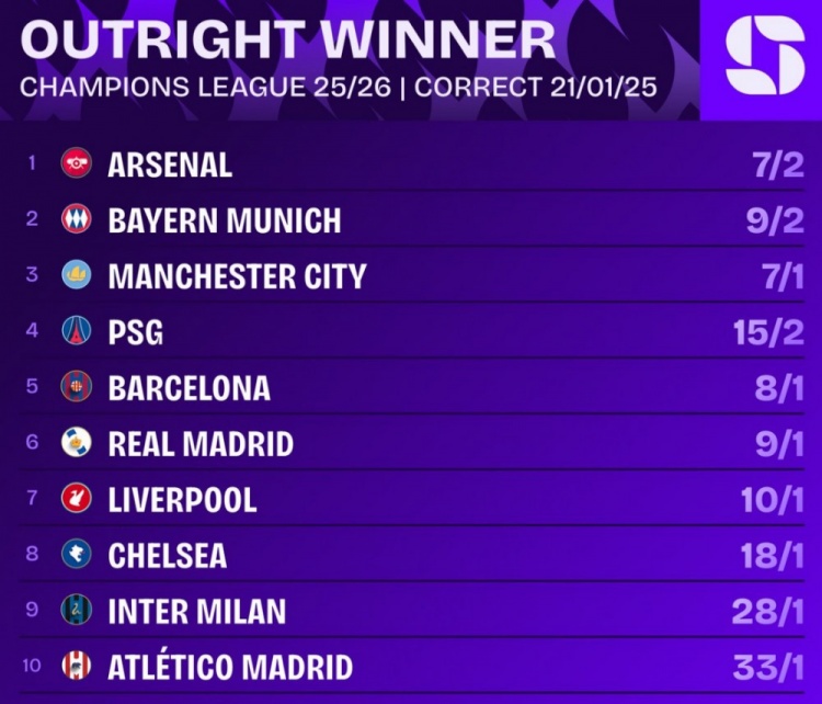 1月22日讯 欧冠联赛阶段第7轮比赛战罢,相关机构给出了欧冠夺冠的最新赔率,阿森纳居首,拜仁、曼城、巴黎前四。