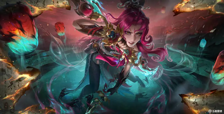这款阿轲皮肤走的是妖灵志异路线,以志怪异闻为灵感。把阿轲设计成了一位既能踏破海市妄境,又能以刃斩尽虚妄邪祟的罗刹妖女(罗刹是佛教夜叉中的一种,在佛教艺术中,罗刹经常被描绘成狰狞可怖的形象,以强调他们的邪恶本质。虽然罗刹在佛教中被视为邪恶的鬼怪,但在某些文化中,他们也被视为具有神奇力量的存在)。